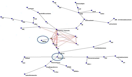 That means that INPH (and, consequently, patients’ behavior) is strictly linked (connection value = 0.99) to animal forms, indicating higher emotional inhibition to common responses (popular) and well-formed responses (connection value between popular responses and forms = 0.99). The number of responses, strictly linked to shape, was also connected to the perception of details in the interpretation, well-formed responses, and the reality index.
