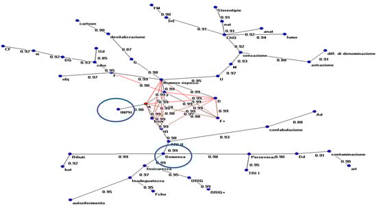 Figure 3 and Figure 4 show the graphs obtained with the ANNs, respectively, both with and without the values showing the relationship among variables. Some variables connected to Rorschach’s interpretation are more closely linked to the diagnosis of INPH and AD.