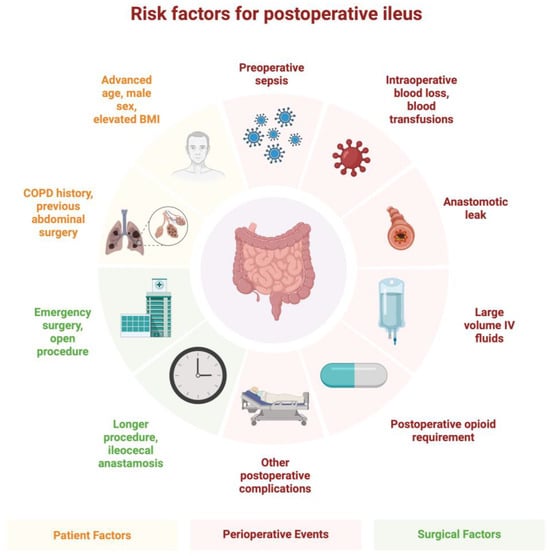 - Quiroga-Centeno, A.C.; Jerez-Torra, K.A.; Martin-Mojica, P.A.; Castaneda-Alfonso, S.A.; Castillo-Sanchez, M.E.; Calvo-Corredor, O.F.; Gomez-Ochoa, S.A. Risk Factors for Prolonged Postoperative Ileus in Colorectal Surgery: A Systematic Review and Meta-analysis. World J. Surg. 2020, 44, 1612–1626. [Google Scholar] [CrossRef] [PubMed]