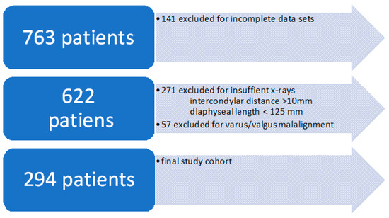 Radiographs that failed to meet the specified quality criteria for reliable tibial slope determination led to the exclusion of the respective patients from the analysis. Of the initially identified 763 patients with meniscal injuries, 141 were excluded due to incomplete datasets. Of the remaining 622 patients, 328 were excluded due to substandard radiograph quality, resulting in a final cohort of 294 patients, see Figure 1. The same quality criteria were applied to the control group.