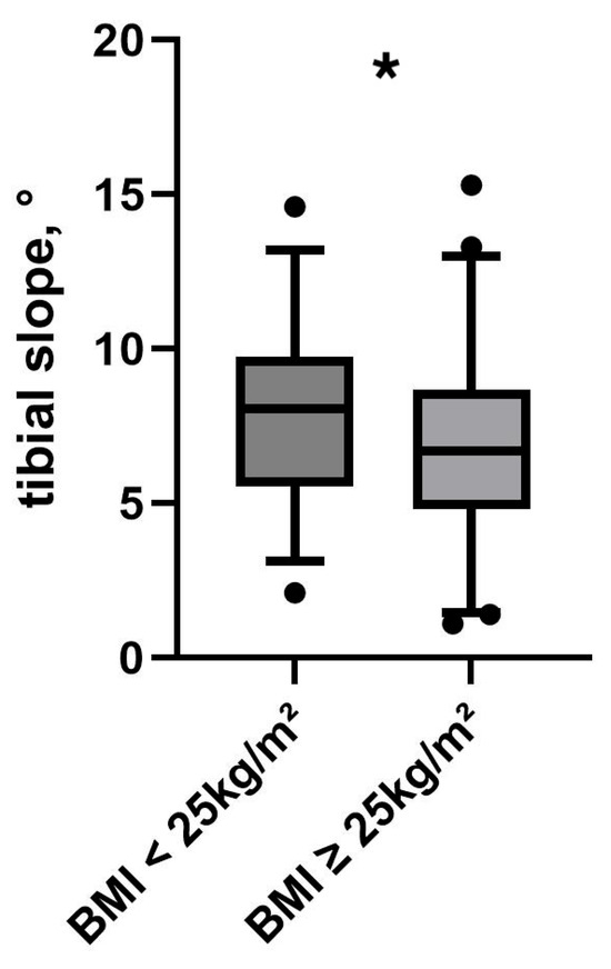 The propensity-score matching analysis with healthy controls further underscores the importance of PTS as a risk factor even in ACL-sufficient knees. Patients with meniscal injuries had significantly increased slopes compared to healthy individuals, emphasizing the potential of PTS as a predictive marker for injury risk in the general population. This finding aligns with the hypothesis that PTS amplifies internal knee forces even in stable joints, creating a predisposition to meniscal damage over time or under repetitive stress. Recent biomechanical studies have shown that with increased PTS, the pressure distribution and meniscal forces change in the ACL and PCL sufficient knee [13,39]. These altered biomechanical conditions may predispose for meniscal injury. Even after controlling for overweight as a confounding factor for meniscal tears [40], the findings demonstrate that normal-weight patients (BMI < 25) had significantly increased slopes than both overweight patients and healthy controls. This suggests that the relationship between PTS and meniscal injury risk is not merely an indirect effect of body weight but rather an independent biomechanical factor.