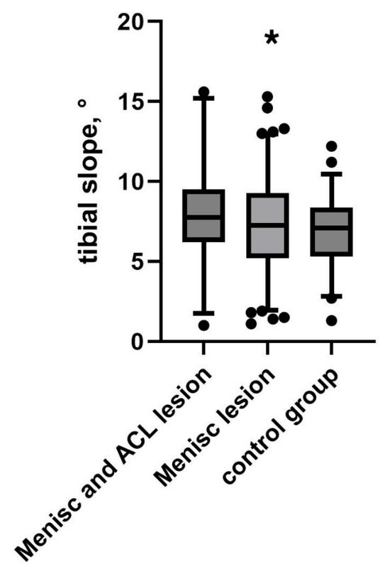 - Deng, X.; Hu, H.; Song, Q.; Zhang, Y.; Liu, W.; Zhu, L.; Zhang, Y. The influence of the steep medial posterior tibial slope on medial meniscus tears in adolescent patients: A retrospective case-control study. BMC Musculoskelet. Disord 2021, 22, 901. [Google Scholar] [CrossRef]