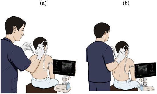 Procedure settings in ultrasound-guided pharmacopuncture (UGP) and non-guided pharmacopuncture (NGP) groups: (a) In the UGP group, the practitioner performs the treatment while observing the ultrasound monitor, while the patient’s view of the screen is intentionally blocked. (b) In the NGP group, the procedure is performed without visual reference to the ultrasound screen by either the practitioner or the patient.