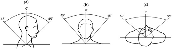 Standardized postures for measuring cervical Active Range of Motion (A-ROM): Cervical A-ROM was measured in the following directions: (a) flexion and extension, (b) lateral flexion to both sides, and (c) rotation to both sides. All measurements were conducted using a goniometer, with the evaluator’s line of sight and posture fixed according to the standardized guidelines provided by the Korea Occupational Safety and Health Agency. The figure illustrates the recommended postural setup and reference angles for each motion.