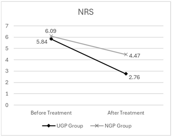 Before the intervention, the UGP group had a mean NRS score of 5.84 (standard deviation (SD) ± 2.06), and the NGP group had a mean score of 6.09 (SD ± 1.20). After the treatment, the NRS score in the UGP group decreased to 2.76 (SD ± 1.53), whereas the NGP group recorded an after-treatment score of 4.47 (SD ± 1.41).