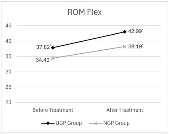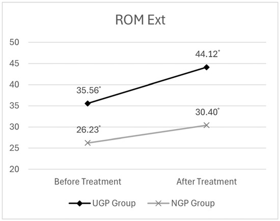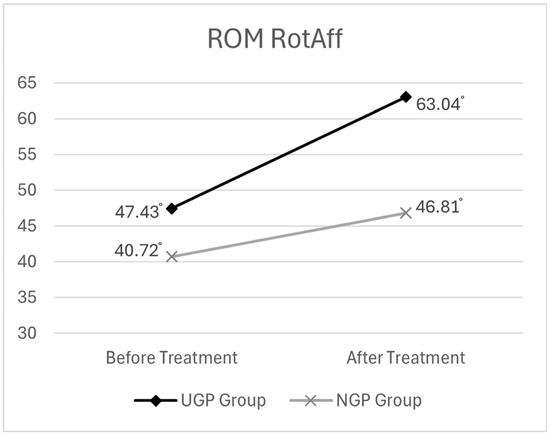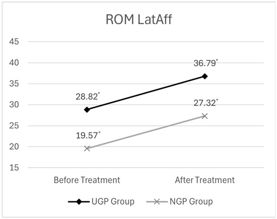 Before treatment, the mean ROM LatAff. was 28.82° (±11.64) in the UGP group and 19.57° (±11.16) in the NGP group. After treatment, the UGP group showed an increased ROM of 36.79° (±10.45), while the NGP group recorded a post-treatment ROM of 27.32° (±10.99).