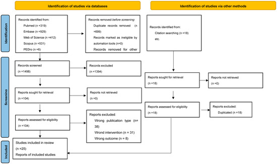 A total of 2215 records were identified, of which 18 were identified through hand searching and the rest through electronic database searches. After the removal of duplicates, 1498 unique records remained. Titles and abstracts were screened for eligibility, leading to the selection of 104 articles for full-text review. Of these, 25 studies met the inclusion criteria and were included in the final synthesis. The study selection process is illustrated in the PRISMA Flow Diagram (Figure 1).