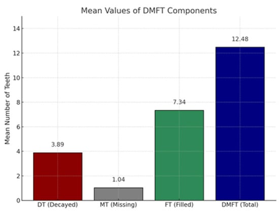The assessment of dental health status using the DMFT index revealed an average score of 12.48 (M = 24.75, SD = 12.12), indicating a high level of dental caries experience. The FT component has the highest value (7.34), indicating increased access to dental services, especially for restorative treatments. In contrast, the DT component has an average value of 3.89, which highlights a fairly high frequency of carious lesions. The MT component obtained the lowest score (1.04) (Figure 1).