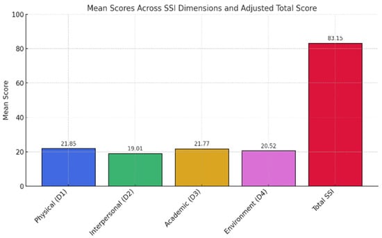 The social dimension (D4), with an average score of 20.52, also falls within the moderate stress area, indicating a partial balance between the academic and social environments. The final score obtained is 83.15, a value that corresponds to moderate perceived stress, pointing to a general condition marked by recurrent adaptive difficulties, without exceeding the level of severe dysfunction, but indicating an increased psychological vulnerability to academic, interpersonal, and contextual stressors (Figure 2).