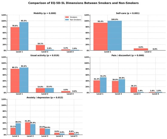 The comparative analysis of the dimensions of quality of life measured by the EQ-5D-5L questionnaire revealed statistically significant differences between smokers and non-smokers in all five domains assessed. In the mobility domain, a significantly lower percentage of smokers (78.6%) reported no difficulties (Level 1), compared to 95.5% of non-smokers (χ2, p = 0.000), indicating more frequent mobility impairment among smokers. Also, in the self-care domain, all non-smokers declared the absence of difficulties, compared to 93.4% of smokers, a difference also significant (χ2 = 0.001).