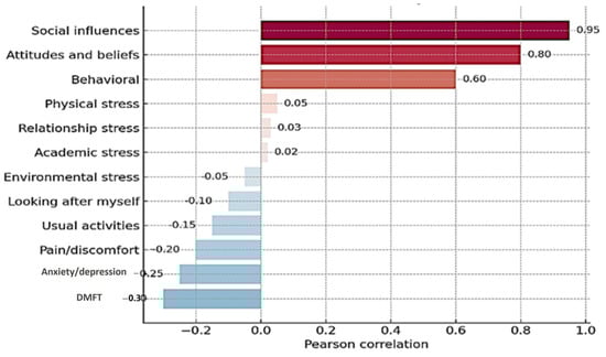 From a biopsychosocial perspective, perceived stress is a psychological factor that can influence health-related behaviors such as smoking, which is often adopted as a coping mechanism. In turn, smoking has well-documented detrimental effects on oral health, through both inflammatory responses and alterations in the oral microbiota. High levels of perceived stress have also been associated with increased risk of dental caries and elevated DMFT scores. For instance, Ben Hassan et al. reported a significant correlation between stress levels and DMFT (r = 0.41, p < 0.01) among medical students [10]. These findings support the inclusion of perceived stress within the same analytical framework as smoking and oral health, allowing for the exploration of both direct and mediated relationships. This integrative model is therefore justified in highlighting the psychobehavioral mechanisms that may influence students’ oral health status [11,12,13].