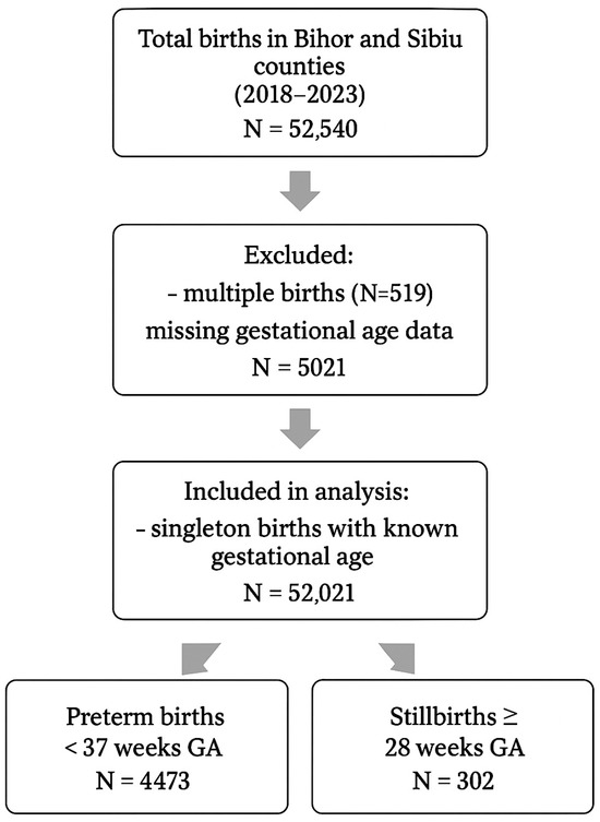 We analyzed all singleton preterm births (n = 4473) and stillbirths (n = 302) in Bihor and Sibiu Counties over 6 years (2018–2023) (Figure 1). The incidence of prematurity and stillbirth during this period was determined and compared between the two counties. To detect associations between the COVID-19 pandemic and lockdown on prematurity and stillbirth rate, we compared the incidences between the pre-pandemic (2018, 2019, and January, February 2020), pandemic (March–December 2020, 2021, and January, February 2022), and post-pandemic periods (March–December 2022, 2023). To account for seasonal variability, six intervals during the analyzed periods were also compared: (1) pre-pandemic winter (January–February–December 2018, January–February–December 2019, January–February 2020) and summer periods (June–August 2018 and June–August 2019), (2) pandemic winter (December 2020, January–February–December 2021, January–February 2022) and summer periods (June–August 2020 and June–August 2021), and (3) post-pandemic winter (December 2022, January, February 2023) and summer periods (June 2022–August 2022 and June 2023–August 2023). Additionally, a comparison was made between the mentioned periods and the strict lockdown period (March–May 2022).