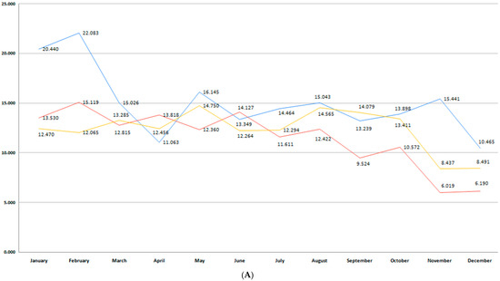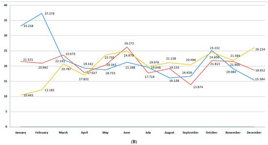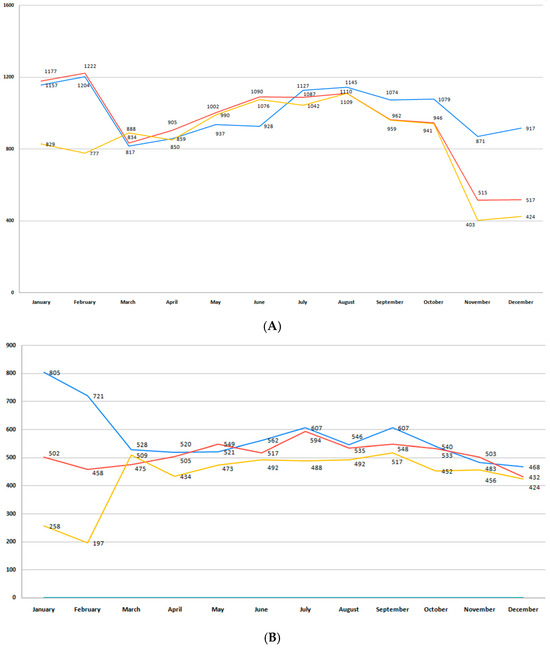 (A) Monthly number of births during the studied period for Bihor County. (B) Monthly number of births during the studied period for Sibiu County. (blue—number of births in the pre-pandemic period; red—number of births in the pandemic period; orange—number of births in the post-pandemic period).