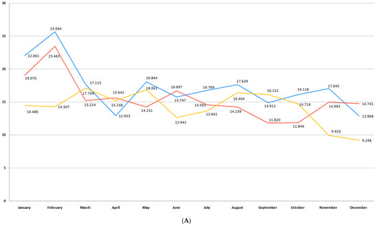 Both regions registered a drop in the number of moderate to late preterm births beginning in 2018. The blue bar in Figure 6A,B shows a peak for both counties during the first months of 2018, 2019, and 2020, with a notable decrease in moderate and late preterm infants in the following years. In the Bihor region, this category of premature infants experienced a continuously declining rate during the pandemic period, as the red trend line illustrates (Figure 6A).