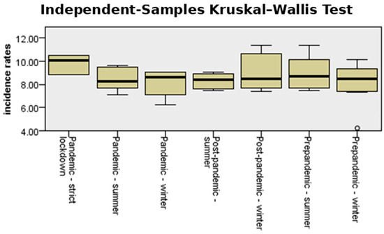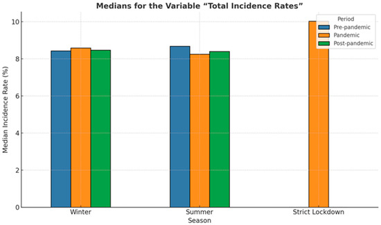 The median incidence during winter and summer registered in the strict lockdown period varied during the analyzed 6-year period between 0.39% in the winter before COVID-19 to 0.12%, the value recorded in the summer that followed the global pandemic (Figure 14). Although the differences are not statistically significant (p = 0.38), the median rates for the summer season were lower than those corresponding to the winter period, regardless of whether they were in the pre-pandemic, pandemic, or post-pandemic years.