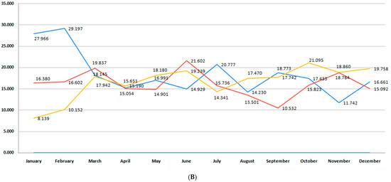 (A) Monthly comparison of very preterm birth rate during the studied period for Bihor County. (B) Monthly comparison of moderate to late preterm birth rate during the studied period for Sibiu County (blue—pre-pandemic period; red—pandemic period; orange—post-pandemic period).