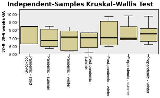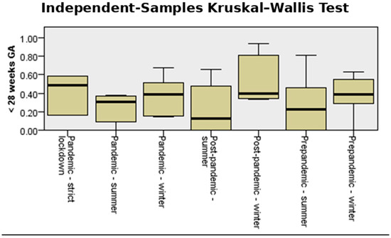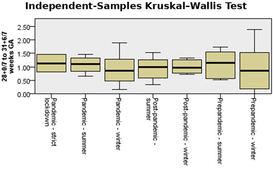 As compared to other studies, no reduction in extremely preterm birth during the COVID-19 pandemic (p = 0.72) or during the lockdown was observed. Seasonal variability in the incidence of extreme prematurity was not found during the 6-year period (p = 0.38); however, median incidences of prematurity tended to be lower during winter, as compared to summer (Figure 14). Hviid et al. [56] assessed the seasonality of extremely preterm birth in a Danish cohort of more than 1 million pregnancies, and reported an association of only 2.8% of all extremely preterm births with seasonality. In this study, the lowest rate of extremely preterm birth was also recorded during winter.