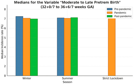 The lowest median incidence of moderate to late preterm birth corresponded to the summer period of the pandemic. During the strict lockdown period, the median incidence was 8.42% higher compared to the periods outside the lockdown (Figure 8).