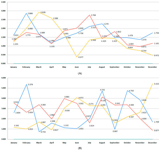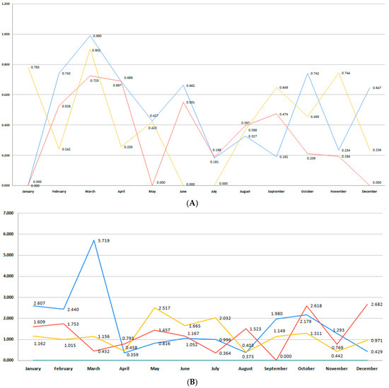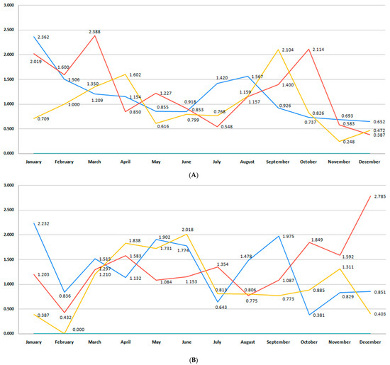 (A) Monthly comparison of extremely preterm birth rate during the studied period for Bihor County. (B) Monthly comparison of extremely preterm birth rate during the studied period for Sibiu County. (blue—pre-pandemic period; red—pandemic period; orange—post-pandemic period).