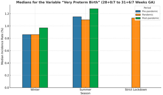 Bar plot illustrating medians for the variable “very preterm birth” across three periods: pre-pandemic (blue), pandemic (orange), post-pandemic (green), and during strict lockdown.