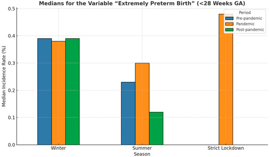 During strict lockdown, the median incidence was similar to the one recorded usually during the summer season for this category of prematurity, irrespective of the period, before, during, or after the pandemic (around 1.1) (Figure 11).