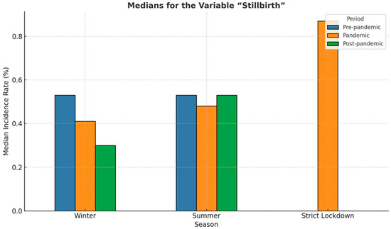 Bar plot illustrating medians for the variable “stillbirth” across three periods: pre-pandemic (blue), pandemic (orange), post-pandemic (green), and during strict lockdown.