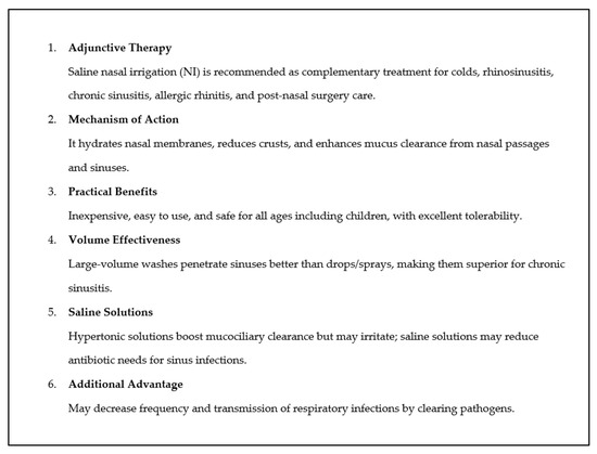 Generally, acute rhinosinusitis primarily begins as a viral infection, frequently progressing to bacterial superinfection. This condition involves concurrent inflammation of the nasal and sinus mucosa [90]. While the traditional treatment relied on antibiotics and corticosteroids [91], further evidence demonstrated the role of NI for children and adults [36,92]. Hyaluronic acid-enriched saline solutions are adjuvant because they reduce rhinologic symptoms and illness duration [93]. Specifically, the 2020 EPOS guidelines strongly encourage using saline NI in rhinosinusitis [94], from initial self-care to post-surgical recovery. These recommendations reflect extensive clinical evidence demonstrating NI’s role in preventing recurrent episodes and reducing chronicity risk [95].