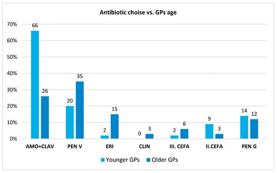 Antibiotic choice depending on the GP’s age. Legend: AMO + CLAV: Amoxicillin clavulanic acid; PEN V: Penicillin V; ERI: Erythromycin; CLIN: Clindamycin; III.CEFA: 3rd generation Cephalosporin; II.CEFA: 2nd generation Cephalosporin; PEN G: Penicillin G.