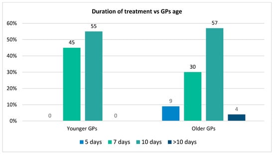 Nearly a half of GPs stated that they commonly prescribe a 10 day-antibiotics regimen (55.4%, n = 31), 39.3% (n = 22) used a 7 day-regimen, while 2 of them treated patients with GAS-pharyngitis for only 5 days (3.6%, n = 2), and 1 GP for more than 10 days (1.8%, n = 1). Younger GPs are more likely to treat GAS for only 7 days (45.45%, n = 15/33 vs. 30.43%, n = 7/23), but there is no significant difference in terms of 7 days (p = 0.07) or 10 days regimens (p = 0.883) between younger and older GPs (Figure 2).