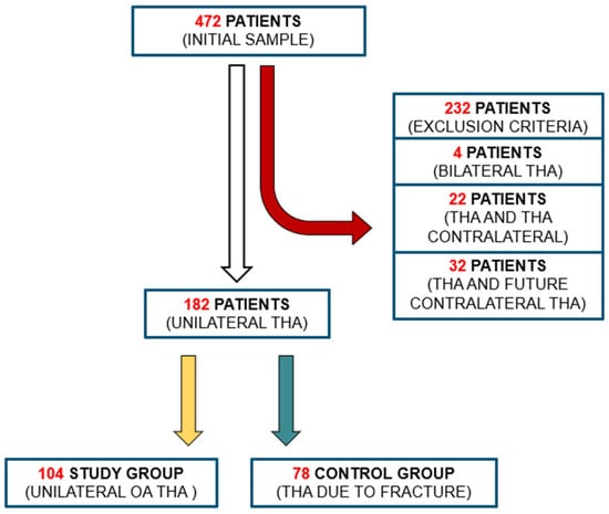 Initially, 472 patients were selected based on the inclusion criteria (Figure 1). The application of exclusion criteria reduced the study cohort to 182 patients who underwent unilateral THA in the absence of a contralateral implant: 104 had a diagnosis of unilateral primary degenerative arthritis (HOA) and 78 had a diagnosis of proximal femoral neck fracture (FNF).