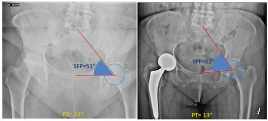 Sacro-femoro-pubic (SFP) angle was measured independently by two authors (G.G., E.M.) at the non-affected hip as shown in Figure 2 for each patient before surgery, immediately after surgery, and finally at the last available follow-up (FU) (average last follow-up time: 32.4 months). The angle was routinely measured on the non-prosthetic hip to assess any variations, as THA can shift the centre of rotation of the joint (often medially), thereby hindering the accurate measurement of the SFP angle: indeed, medializing the centre of rotation of the hip, as typically occurs in THA, would increase the SFP angle of the same hip, thereby simulating pelvic anteversion. Conversely, assessing the SFP angle on the contralateral hip inherently minimizes the risk of measurement bias. Excellent interobserver reliability was verified for the SFP angle (ICC superior to 0.9). Pelvic tilt (PT) was derived for each patient, according to the nearly-linear correlation with the SFP angle []: PT = 75 − SFP.