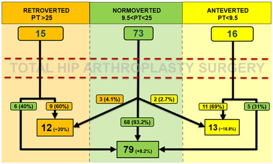 Three groups of patients were formed according to PT: the grouping criteria were established considering our data distribution (specific cut-off values for the pelvic version are not validated by the current literature). The mean PT +/− 1 DS (7.76°) was considered as the median reference. Patients with a PT > 25° were included in the retroverted pelvis group (16 cases), those with PT between 9.5° and 25° were included in the normoverted group (73 patients), while those with PT < 9.5° were included in the anteverted group (15 cases).
