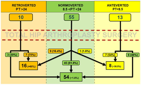 The mean postoperative PT was 17.83° ± 7.46° (range: 1.38° to 34.95°). Using the same cut-offs as in the preoperative evaluation, patients were similarly grouped in the postoperative period: 16 patients showed a retroverted pelvis, 54 patients were normoverted and 8 patients were anteverted.