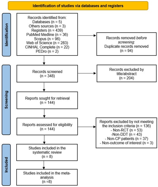 A total of 439 references were retrieved from the following databases: PubMed Medline (n = 36), Scopus (n = 96), Web of Science (n = 283), CINAHL Complete (n = 22), and PEDro (n = 2). An additional three references were identified through other sources, such as the reference lists. After removing 94 duplicates, 348 studies were screened by title and abstract. Firstly, 204 references were excluded for not being relevant by title/abstract and, later, 136 studies for not meeting the inclusion criteria (non-RCT n = 53, non-DTT n = 43, non-children with CP n = 37, and non-outcomes of interest n = 3). Finally, eight RCTs were included in the present SRMA [,,,,,,,]. The inter-rater agreement in the study selection process was excellent (κ = 0.91). The study selection process is summarized in the PRISMA flow diagram (Figure 1).
