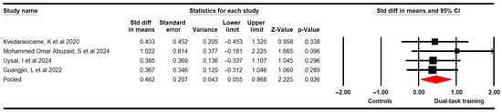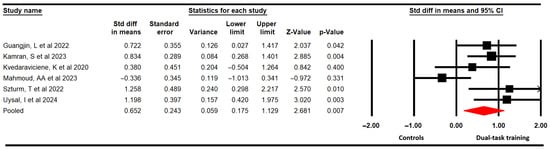 Subgroup analysis revealed that the motor–cognitive dual-task is more effective than only the motor single task (SMD = 0.52; 95% CI 0.02 to 1.1; p = 0.042; I2 = 0%; χ = 0.05; df = 1; p = 0.82).