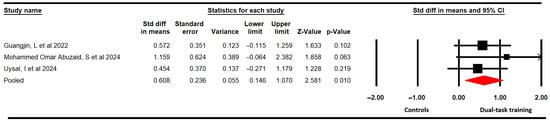 The effectiveness of DTT on dynamic balance was assessed, including three studies [,,] with three independent comparisons that provided data from 76 participants (25.3 per study) using the Timed Up and Go Test (TUG). Our findings showed low-quality evidence that DTT is largely effective (SMD = 0.61; 95% CI 0.15 to 1.1; p = 0.01; I2 = 0%; χ = 0.96; df = 2; p = 0.62) in improving dynamic balance (Figure 3) without risk of publication bias (Egger p = 0.31). Additionally, the meta-analysis revealed that DTT can reduce 1.45 points (95% CI 0.15 to 2.76; p = 0.029; I2 = 10.7%; χ = 2.24; df = 2; p = 0.32) in the score in the TUG (Supplementary Figure S2).
