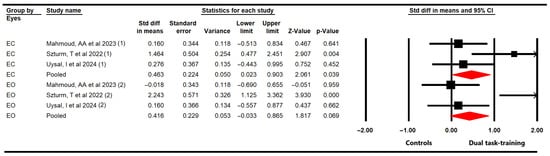 Subgroup analysis revealed that the motor–cognitive dual task is more effective than only the motor single task during EC (SMD = 0.64; 95% CI 0.11 to 1.27; p = 0.02; I2 = 55.5%; χ = 3.53; df = 1; p = 0.06).