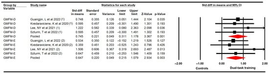 Subgroup analysis revealed that the motor–cognitive dual task is more effective than only the motor single task for GMFM-D (SMD = 0.79; 95% CI 0.28 to 1.29; p = 0.002; I2 = 0%; χ = 0.74; df = 2; p = 0.69) and for GMFM-E dimensions (SMD = 0.74; 95% CI 0.24 to 1.23; p = 0.004; I2 = 0%; χ = 2; df = 2; p = 0.37).