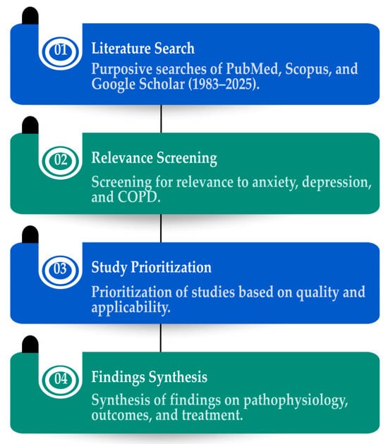 This narrative review was designed to synthesise the evidence on the clinical burden, proposed mechanisms linking anxiety and depression to COPD, and management strategies for COPD. To ensure conceptual depth and contemporary relevance, the literature search spanned from 1983 to July 2025, integrating both foundational and current research. A search was conducted using PubMed, Scopus, and Google Scholar. The search terms included combinations of the following terms: “COPD”, “chronic obstructive pulmonary disease”, “depression”, “anxiety”, “psychological comorbidity”, “pulmonary rehabilitation”, “cognitive behavioural therapy (CBT)”, “relaxation therapy”, “antidepressants”, “dyspnea”, “screening tools”, “quality of life”, and “pharmacological treatment”. The selection process is illustrated in Figure 1.