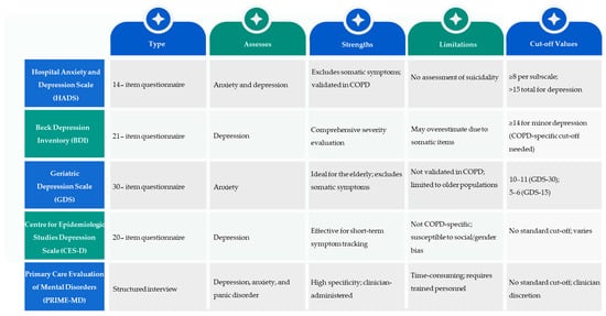 Depression and anxiety are common comorbid conditions in COPD that are often underdiagnosed and undertreated in clinical practice. The neglect of these psychiatric disorders may result in marked clinical consequences, such as exaggerated respiratory complaints, higher use of health services, lower adherence to COPD therapy, and increased mortality. Despite this, mental health screening is not a common practice in COPD treatment due to a range of systemic and clinician- and patient-related reasons [55]. Regular and early detection would lead to better patient outcomes, as this would allow treatments to be initiated early and potentially reduce the effects of the chronic psychological burden among COPD patients [56]. Figure 4 shows the most commonly used screening tools for anxiety and depression in COPD based on their clinical focus, validation status, and known limitations.