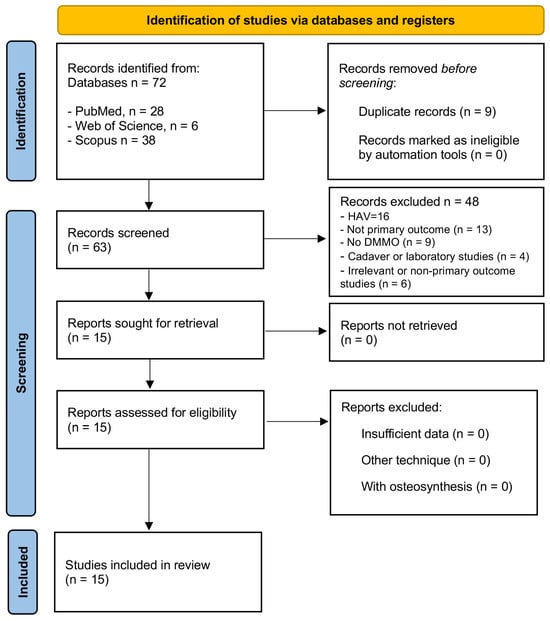 After this process, 15 articles were selected for full-text reading, which met the established criteria and were included in the systematic review. This process allowed us to form a specific body of evidence, focused on the clinical application of DMMO in the lesser metatarsals, ensuring the relevance, applicability, and quality of the included studies.