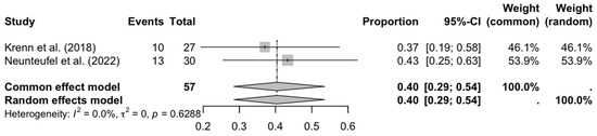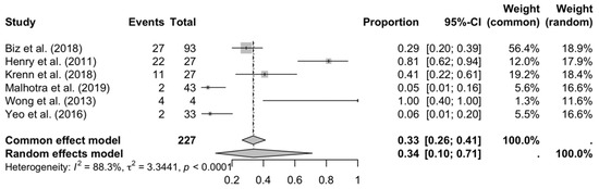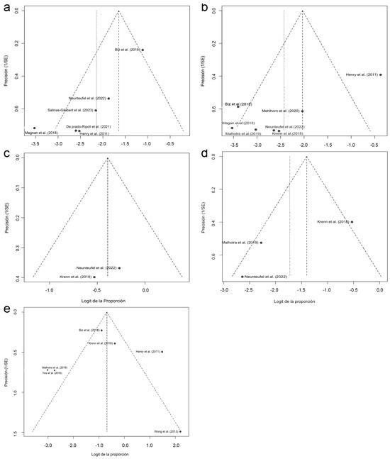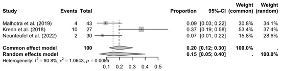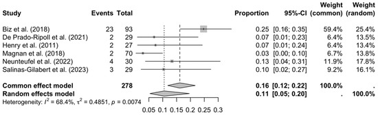 Regarding transfer metatarsalgia (see Figure 3), the overall proportion was low (8%), but the high heterogeneity (I2 = 80.4%) and the identified outlier (Henry et al., 2011 [16]; 27%) raise questions about possible biases or differences in rehabilitation protocols. The asymmetry in the funnel plot reinforces the need for caution when interpreting these results, as studies with lower proportions may be underrepresented.