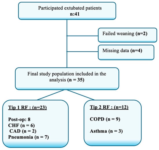 The study included adult patients (≥18 years) who were successfully weaned from mechanical ventilation. Successful weaning was defined as maintaining spontaneous breathing without the need for reintubation or non-invasive ventilation for at least 48 h following extubation. A total of 35 patients met the inclusion criteria and were categorized into two groups based on the type of respiratory failure (RF): 23 patients with Type 1 RF (hypoxemic) and 12 patients with Type 2 RF (hypercapnic). Among the Type 1 RF group, 8 patients were postoperative surgical cases, 6 had congestive heart failure, 2 had coronary artery disease, and 7 had pneumonia. In the Type 2 RF group, 9 patients were diagnosed with chronic obstructive pulmonary disease (COPD) and 3 with asthma. Patients with missing data or who required any form of mechanical ventilatory support within 48 h post-extubation were excluded. A flow diagram summarizing the eligibility and inclusion process is presented in Figure 1. All extubated patients were discharged following ward follow-up, and all exhibited stable mental status.