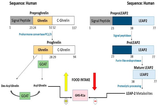 Human ghrelin and LEAP2: processing pathways and impact on food intake. Abbreviations: GOAT: ghrelin O-acyltransferase; GHS-R1a: growth hormone secretagogue receptor-1a. This figure was created by the authors using PowerPoint, inspired by pathway illustrations in References [28,50,54].