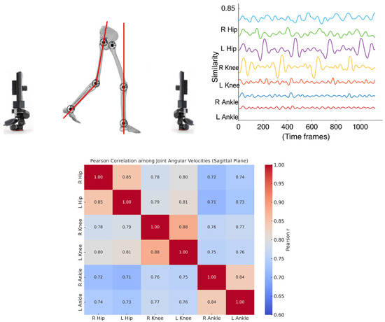 Analysis of lower-limb joint coordination during gait. The left panel shows a schematic representation of joint angles in the sagittal plane while walking. The top-right panel illustrates time series of joint similarity values (e.g., angular velocity patterns) for the right and left hips, knees, and ankles across time frames. The bottom-right panel presents a Pearson correlation matrix quantifying the similarity among joint angular velocities, indicating strong intra-limb and inter-limb coordination, particularly between homologous joints (e.g., left and right hips, knees, and ankles).