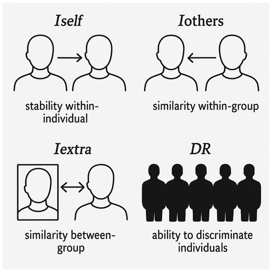 Schematic representation of the four indices used to analyze identity and individual discriminability. Iself indicates within-individual stability over time; Iothers represents similarity between individuals within the same group (within-group similarity); Iextra shows similarity between individuals from different groups (between-group similarity); DR (Discrimination Ratio) highlights the ability to distinguish one individual from others, reflecting their uniqueness within the sample.