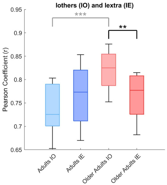 Interaction between group and condition in similar metrics. Box plots show the comparison between intra-group similarity (Iothers) and cross-group similarity (Iextra) for both adults and older adults. A two-way ANOVA revealed significant main effects of group and group × condition interaction. Post hoc tests indicated that, in older adults, Iothers was significantly higher than Iextra, whereas no such difference was observed in the adult group. Difference between both group is reported in light grey, as shown in Figure 1, yet. Asterisks indicate significant differences between groups (** p < 0.01, *** p < 0.001).