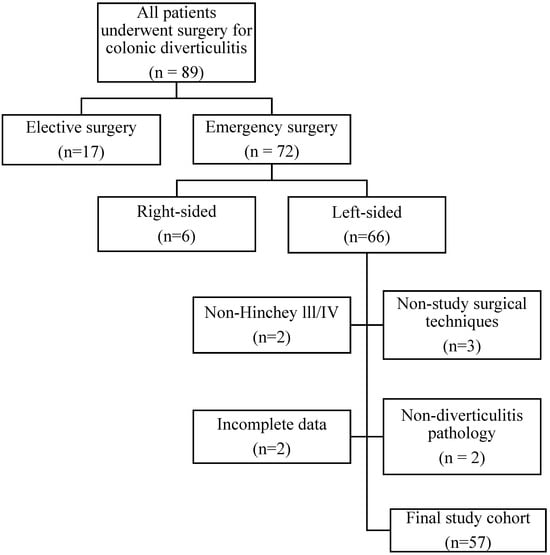 - Patients who have been treated operatively for reasons other than Hinchey stage III-IV (e.g., ileus, bleeding, fistula, unresponsiveness to conservative treatment),