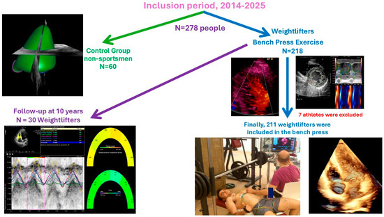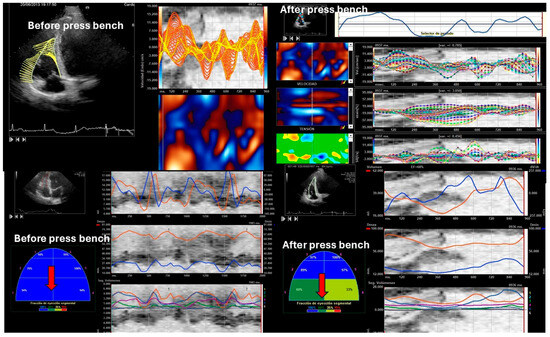 Measurements were taken before and immediately after exercise. Echocardiography was conducted on the bench press apparatus. Initially, echocardiography was performed, followed by the bench press exercise, and immediately afterward, another echocardiography was conducted. The inclusion phase occurred from June 2014 to February 2020, and from 2023 to December 2024. The control group was included from 2015 to April 2025. This study was paused during the years 2020 to 2022 due to the COVID-19 pandemic. This research was performed as part of the PAIDI CTS 606 Andalusian Health Service Project No. PI-0585-2012. It has received approval from the local ethics committee and funding from the Department of Health of the Government of Andalusia, Spain.