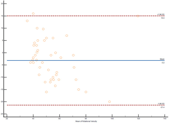 The Bland–Altman plot demonstrates interobserver agreement in longitudinal strain measurements of the right ventricle among weightlifters, as shown in Figure 2.